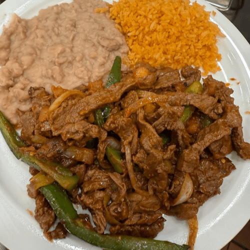 Marinaded skirt steak with onions, tomatoes & jalapeño. Served with rice, black refried beans , and corn tortillas.
