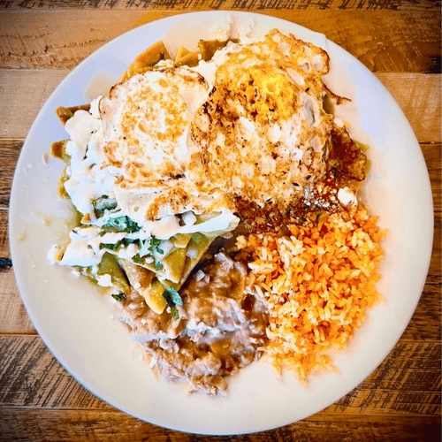 Tortilla chips simmered in your choice of spicy red or green sauce with eggs, onion, cilantro, sour cream & cheese. Served with rice, and refried black beans.