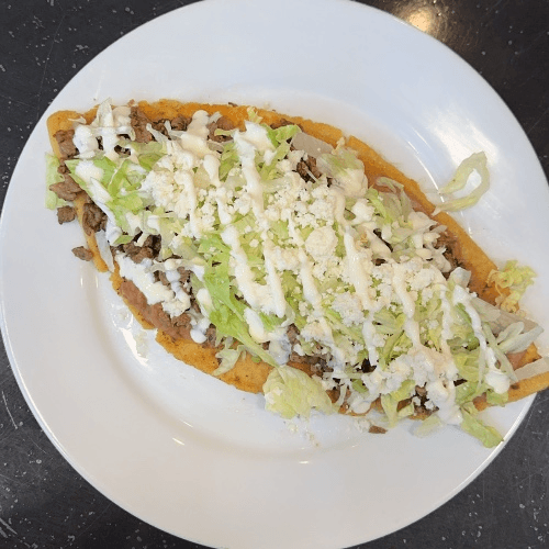 A flat oval shaped masa layered with black refried beans, lettuce, sour cream & cheese with your choice of meat